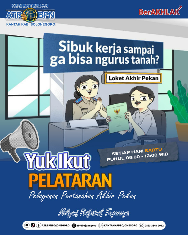 Masyarakat Kabupaten Bojonegoro kini diimbau untuk tidak menunda lagi urusan pertanahan mereka. Cukup datang ke Kantor Pertanahan Kabupaten Bojonegoro pada hari Sabtu dan rasakan kemudahan layanan PELATARAN!