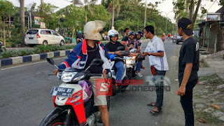 Bertempat di perempatan lampu merah jalan Pemuda Bojonegoro, puluhan remaja ini satu persatu membagikan takjil kepada para pengguna jalan yang melintas dijalur tersebut.