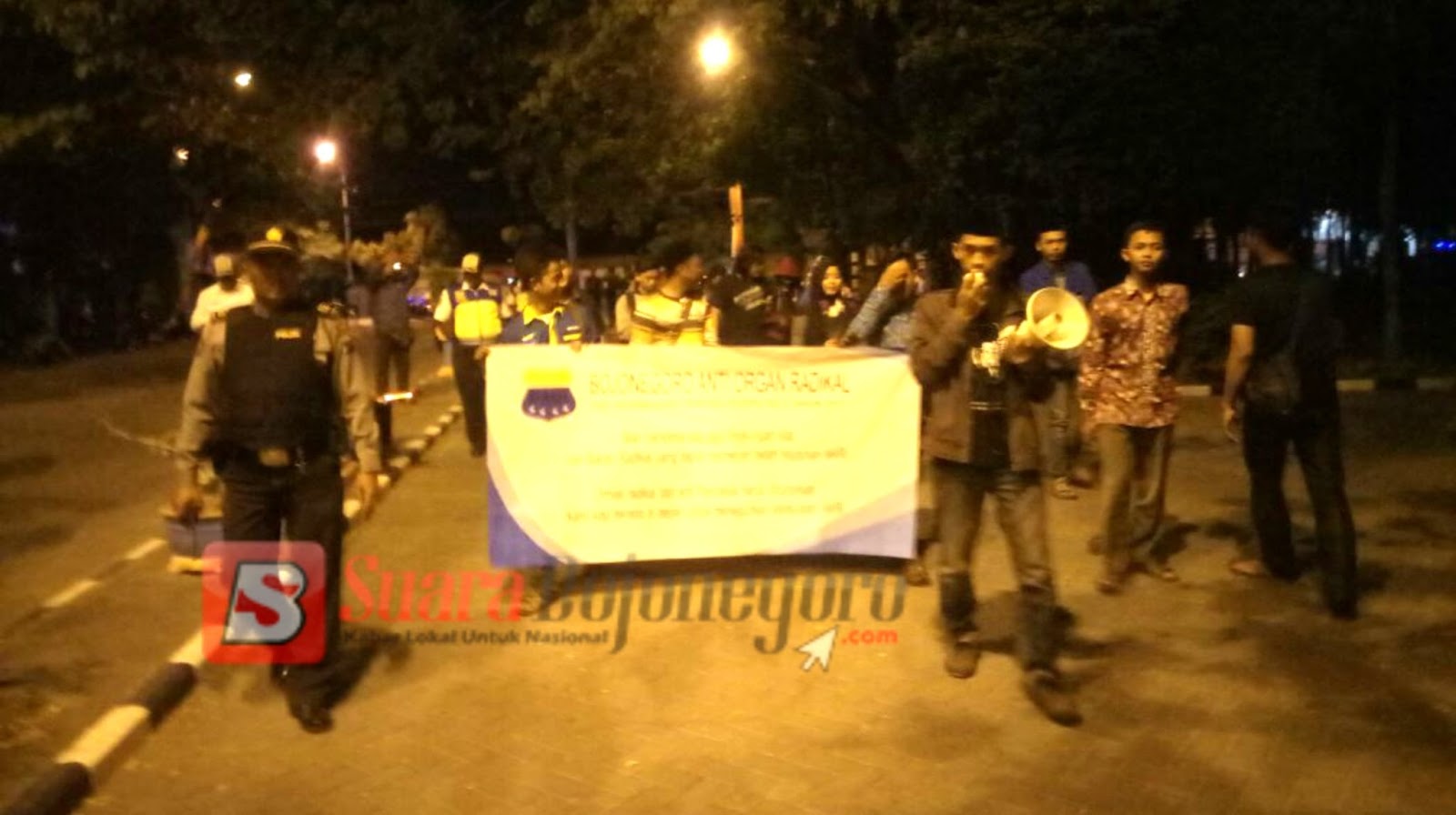 Aksi Damai digelar di Terminal Rajekwesi Bojonegoro, dengan berorasi, menyalakan lilin dan membagikan selebaran serta bunga untuk pengguna jalan. Tampak puluhan mahasiswa yang tergabung dalam PMII Bojonegoro dengan membawa tulisan deklarasi dukungan untuk segera disahkan Perppu No 2 Tahun 2017, agar Bojonegoro dan NKRI ini terhindar dari organ yang anti Pancasila, sekuler dan radikal.